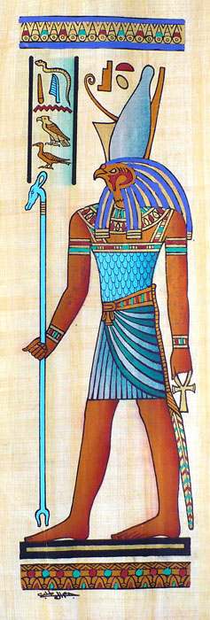 Horus, le dieu faucon est le fils d'Isis et Osiris. C'est le dieu des espaces et de l'azur, ses yeux sont la lune et le soleil. Il fut abandonné par sa mère dans des marécages afin qu'il ne subisse pas les violences de son oncle Seth. A la mort de son père, Horus revendiqua l'héritage de son père que Seth s'était attribué. Après de nombreux procès et discussions Seth défia Horus qui perdu ses yeux dans la bataille. Horus demanda que justice soit faite et les dieux écrivirent à Osiris défunt. Celui ci répondit que si son fils ne récupérait pas ce qui lui était du, il enverrait les démons du monde souterrain au royaume des Dieux. Horus devint dès lors roi.
