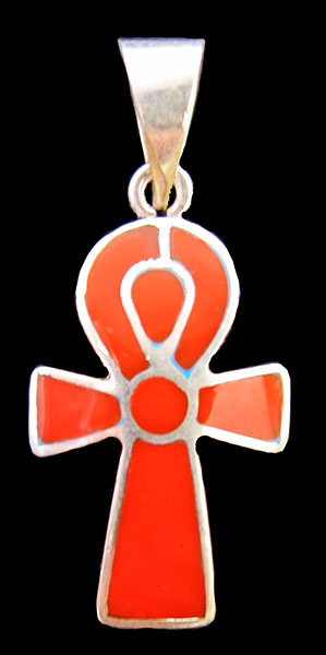 croix Ankh Argent 800/1000 double face avec incrustation cornaline sur un coté et lapis-lazuli de l'autre. * poids bijoux : 4,5 g . * Taille : hauteur =3,6 cm, largeur =1,6 cm, . Histoire : La clé de vie Ankh en tant que signe hiéroglyphique représente les attaches d'une sandale vue de dessus, elle sert à écrire le mot Ankh (= la vie, vivre). La clé de vie Ankh est le symbole des millions d'années de vie future. Divinités et Pharaons défunts peuvent la tenir en main car ils sont vivants pour l'éternité. Dans d'autres scènes, un Dieu ou une Déesse peut présenter le souffle de vie à hauteur des narines du roi. C'est le symbole, avec l'offrande de la Maât, des liens étroits qui existent entre la royauté et le monde des Dieux.. Le cadeau porte-chance..