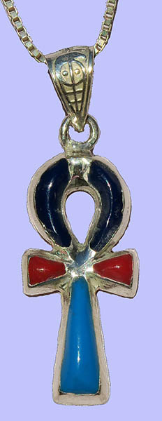 croix Ankh Argent 800/1000 avec incrustation turquoise, lapis-lazuli et cornaline * poids bijoux : 2 g . * Taille : hauteur =3,7 cm, largeur =1,2 cm, . Histoire : La clé de vie Ankh en tant que signe hiéroglyphique représente les attaches d'une sandale vue de dessus, elle sert à écrire le mot Ankh (= la vie, vivre). La clé de vie Ankh est le symbole des millions d'années de vie future. Divinités et Pharaons défunts peuvent la tenir en main car ils sont vivants pour l'éternité. Dans d'autres scènes, un Dieu ou une Déesse peut présenter le souffle de vie à hauteur des narines du roi. C'est le symbole, avec l'offrande de la Maât, des liens étroits qui existent entre la royauté et le monde des Dieux.. Le cadeau porte-chance..