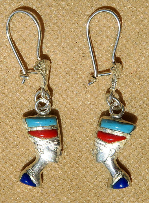 Bijoux Boucles d'oreilles Profil de Néfertiti Argent 800/1000 Argent seul sur un profil, avec incrustation Turquoise, lapis-lazuli et cornaline sur l'autre profil * poids bijoux : 6g les 2 . * Taille : longueur = 5cm, largeur =2,3 cm, . Histoire : Néfertiti, « La Belle est venue », à la beauté légendaire, fut la Grande épouse royale d'Akhénaton, l'un des derniers rois de la XVIIIe dynastie avec qui elle exerça un rôle politique et religieux important pendant la fondation de la première religion monothéiste dédiée au culte du dieu Aton : la période amarnienne. Le cadeau égyptologique .