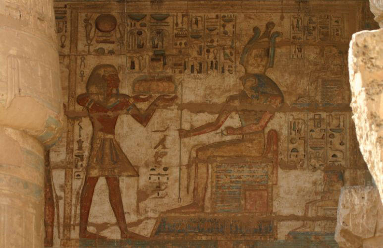 Grande carte postale d'une scène d'offrande de Ramsès III au dieu Horus, temple des millions d'années de Ramsès III à Medinet Habou, Louxor.