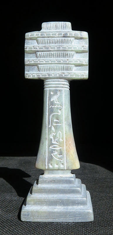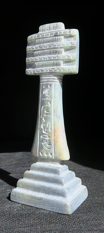 Statuette Pilier Djed en pierre stéatite sur socle.