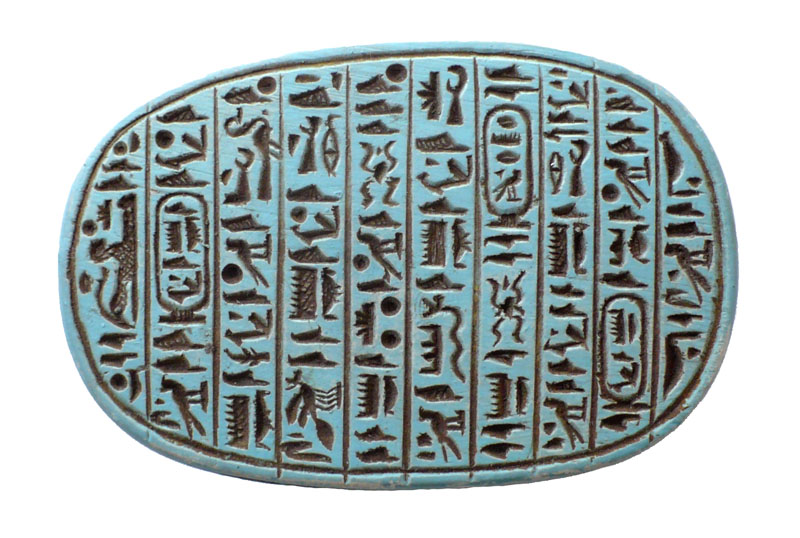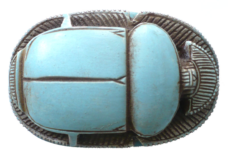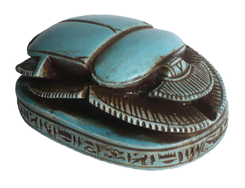 Scarabée est un coléoptère que les anciens égyptiens nommaient Kheper. En hiéroglyphes, il sert à écrire le terme abstrait et complexe Kheper(= venir à l'existence , être , devenir . L'homophonie associe le scarabée aux idées de régénération et de renaissance. A l'image du scarabée qui pousse devant lui une boule de terre, le dieu de la renaissance Kheper pousse le soleil et l'aide à renaître chaque matin, à l'aube. A Héliopolis (capitale du culte solaire en Egypte), Khépri (=soleil levant) est considéré comme une manifestation du démiurge créateur du Monde). La forme du scarabée a été utilisée pour des usages multiples. Il est utilisé comme cachets, il est alors monté en bague ou en pendentif et sert alors à estampiller les scellés d'argile protégeant les documents officiels (ex :les ordres donnés aux hauts fonctionnaires), les verrous (ex : quand une tombe est fermée après les funérailles) et les récipients (ex : les jarres contenant le vin, très apprécié des anciens égyptiens). IL est aussi utilisé comme amulettes, efficaces et peu coûteuses, elles assurent une protection magique aux vivants. Dans ce cas, le ventre du scarabée est orné d'une inscription (titres d'un fonctionnaire, titulature royale aux vertus protectrices, voeu, texte commémoratif d'un événement officiel) ou d'un dessin. Enfin on le retrouve comme scarabées de coeur, ils sont placés sur la momie ou enchâssés dans un pectoral, et ils doivent assurer la renaissance du défunt. Dans ce cas, le ventre du scarabée comporte souvent le chapitre CXXV(=celui de la pesée de l'âme) du Livre des morts.