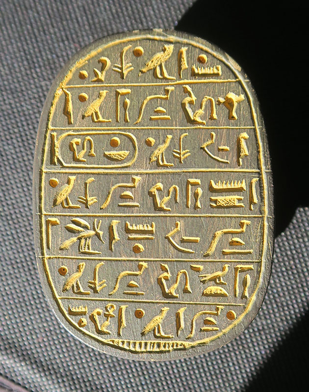Scarabée est un coléoptère que les anciens égyptiens nommaient Kheper. En hiéroglyphes, il sert à écrire le terme abstrait et complexe Kheper(= venir à l'existence , être , devenir . L'homophonie associe le scarabée aux idées de régénération et de renaissance. A l'image du scarabée qui pousse devant lui une boule de terre, le dieu de la renaissance Kheper pousse le soleil et l'aide à renaître chaque matin, à l'aube. A Héliopolis (capitale du culte solaire en Egypte), Khépri (=soleil levant) est considéré comme une manifestation du démiurge créateur du Monde). La forme du scarabée a été utilisée pour des usages multiples. Il est utilisé comme cachets, il est alors monté en bague ou en pendentif et sert alors à estampiller les scellés d'argile protégeant les documents officiels (ex :les ordres donnés aux hauts fonctionnaires), les verrous (ex : quand une tombe est fermée après les funérailles) et les récipients (ex : les jarres contenant le vin, très apprécié des anciens égyptiens). IL est aussi utilisé comme amulettes, efficaces et peu coûteuses, elles assurent une protection magique aux vivants. Dans ce cas, le ventre du scarabée est orné d'une inscription (titres d'un fonctionnaire, titulature royale aux vertus protectrices, voeu, texte commémoratif d'un événement officiel) ou d'un dessin. Enfin on le retrouve comme scarabées de coeur, ils sont placés sur la momie ou enchâssés dans un pectoral, et ils doivent assurer la renaissance du défunt. Dans ce cas, le ventre du scarabée comporte souvent le chapitre CXXV(=celui de la pesée de l'âme) du Livre des morts.