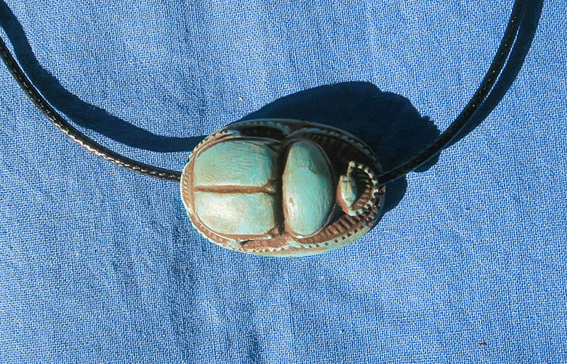 * Histoire : Scarabée est un coléoptère que les anciens égyptiens nommaient Kheper. En hiéroglyphes, il sert à écrire le terme abstrait et complexe Kheper(= venir à l'existence , être , devenir . L'homophonie associe le scarabée aux idées de régénération et de renaissance. A l'image du scarabée qui pousse devant lui une boule de terre, le dieu de la renaissance Kheper pousse le soleil et l'aide à renaître chaque matin, à l'aube. A Héliopolis (capitale du culte solaire en Egypte), Khépri (=soleil levant) est considéré comme une manifestation du démiurge créateur du Monde). La forme du scarabée a été utilisée pour des usages multiples. Il est utilisé comme cachets, il est alors monté en bague ou en pendentif et sert alors à estampiller les scellés d'argile protégeant les documents officiels (ex :les ordres donnés aux hauts fonctionnaires), les verrous (ex : quand une tombe est fermée après les funérailles) et les récipients (ex : les jarres contenant le vin, très apprécié des anciens égyptiens). IL est aussi utilisé comme amulettes, efficaces et peu coûteuses, elles assurent une protection magique aux vivants. Dans ce cas, le ventre du scarabée est orné d'une inscription (titres d'un fonctionnaire, titulature royale aux vertus protectrices, voeu, texte commémoratif d'un événement officiel) ou d'un dessin. Enfin on le retrouve comme scarabées de coeur, ils sont placés sur la momie ou enchâssés dans un pectoral, et ils doivent assurer la renaissance du défunt. Dans ce cas, le ventre du scarabée comporte souvent le chapitre CXXV(=celui de la pesée de l'âme) du Livre des morts.
